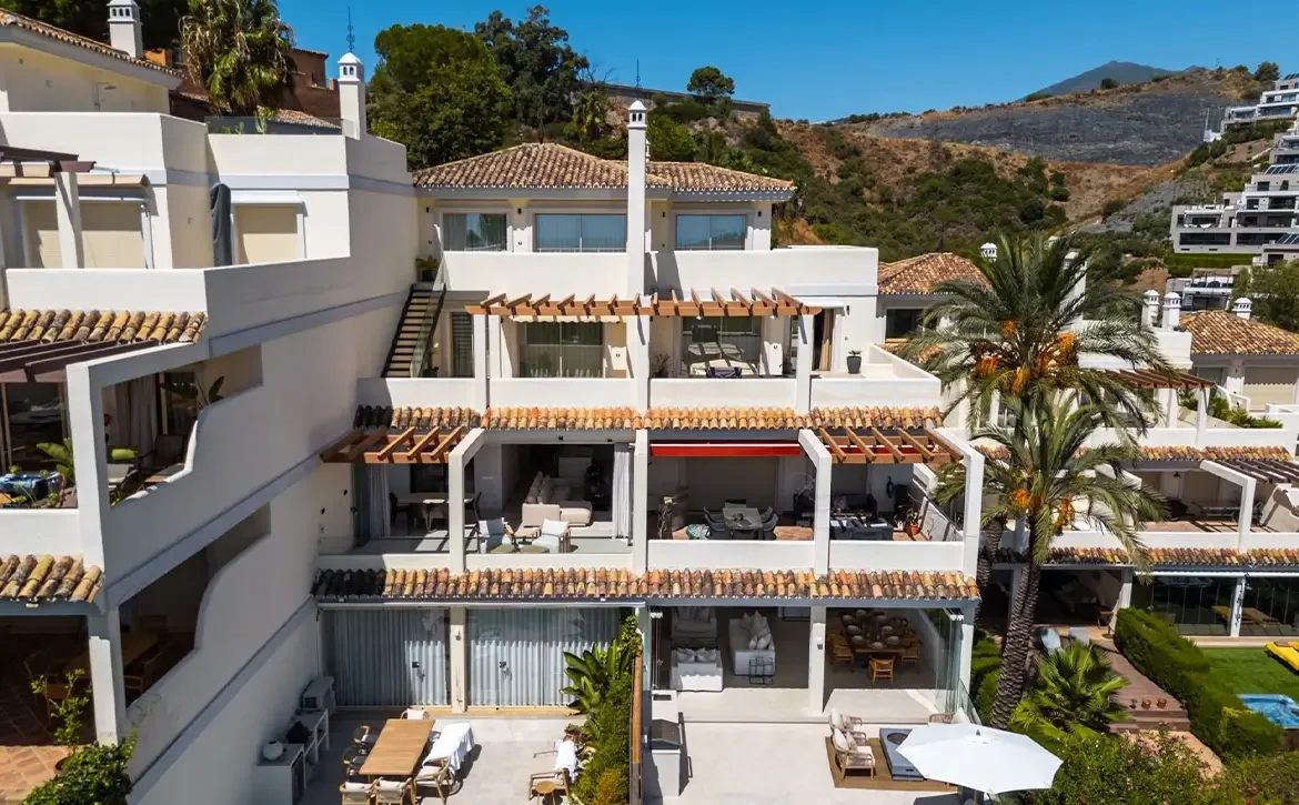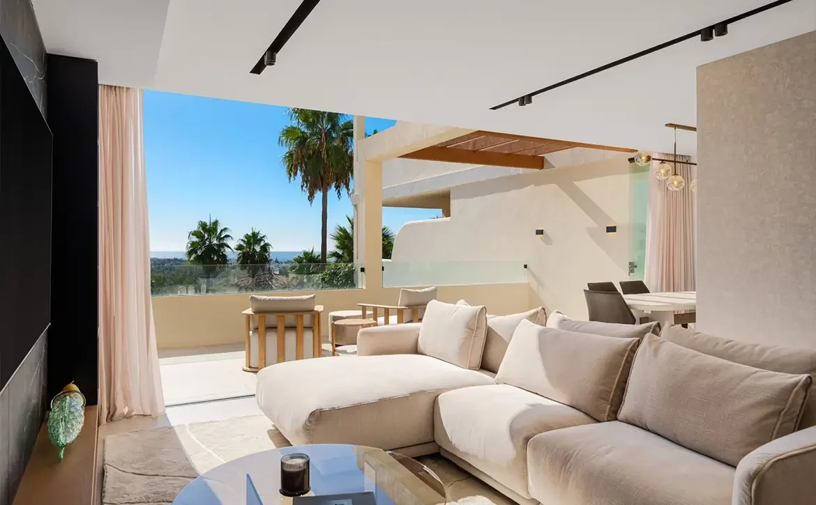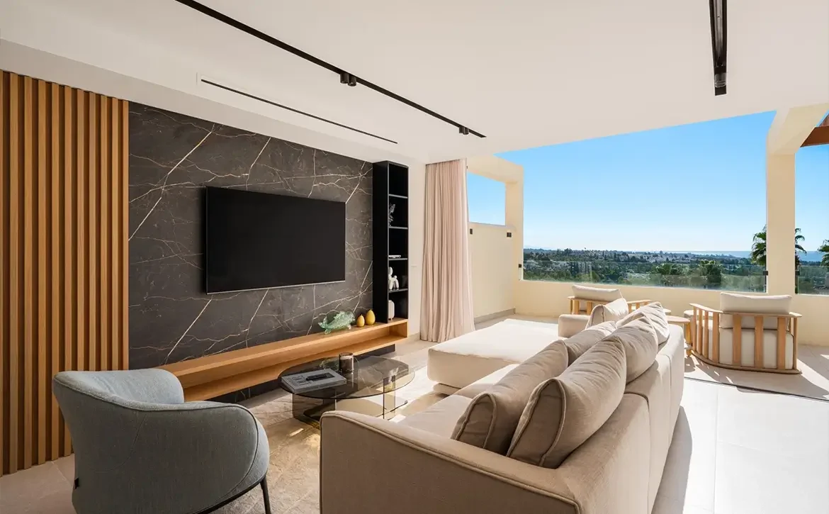 Apartment Jasmine – a modern three-bedroom residence that combines elegant design, panoramic views, and the prestige of one of Nueva Andalucía’s most exclusive communities. Located in Palacetes Los Belvederes, this beautifully renovated property offers 170 m² of stylish living space and a private terrace overlooking La Concha mountain, the Mediterranean Sea, and a serene lake. Originally built in 2003 and fully modernised in 2024, Apartment Jasmine perfectly blends timeless architecture with contemporary comfort.